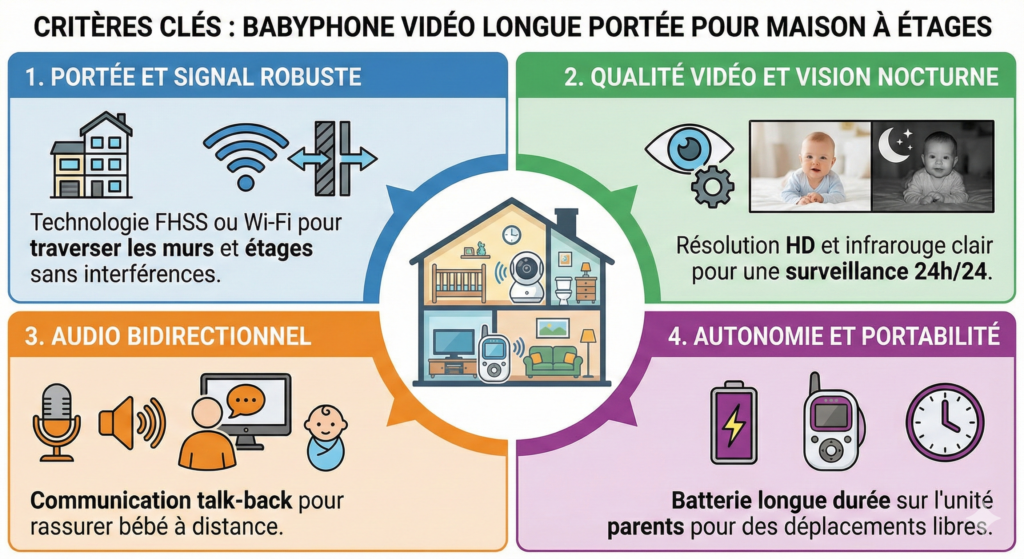 Trouver le bon babyphone vidéo pour une maison à étages relÚve davantage du bon sens technique que du gadget. Oubliez les berceuses polyphoniques et les veilleuses intégrées, et concentrez-vous sur la transmission.